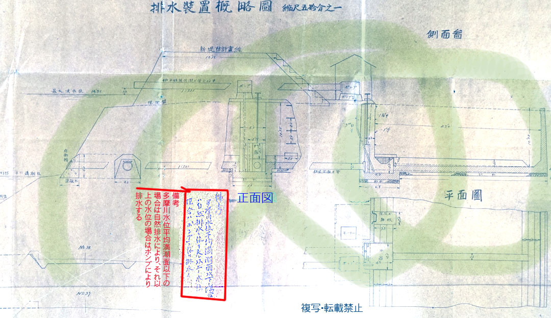 | ↑多摩川の水位上昇対策で排水ポンプ室が設置された |