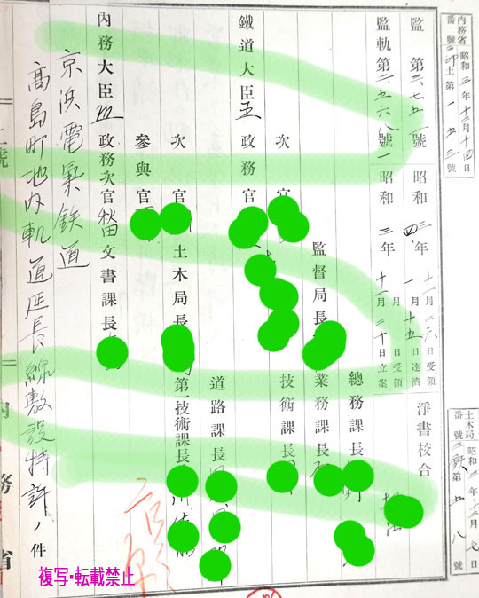 ↑路線変更申請後に鉄道省内部で申請書に対する内容検討。