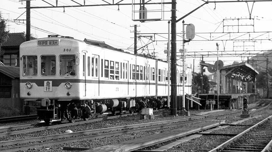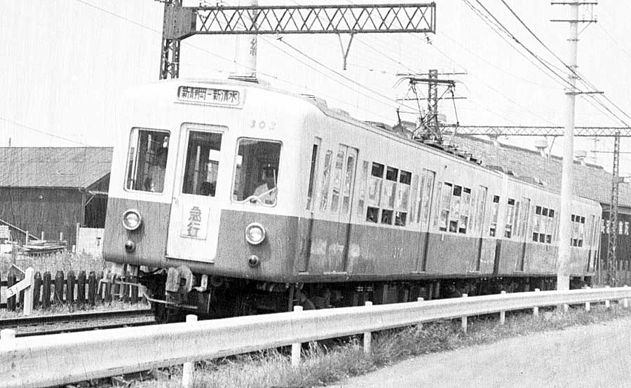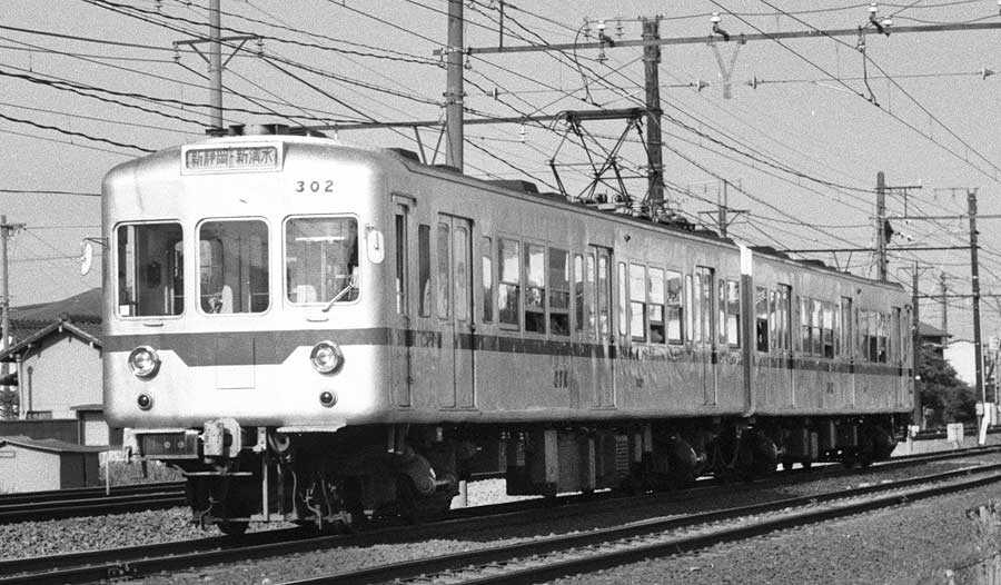 | ↑1977.05撮影 貫通路が埋められて300系は銀色になった。 1000系が導入されたのでステンレスカーに近い高性能車をアピールするために塗色変更したのか? |