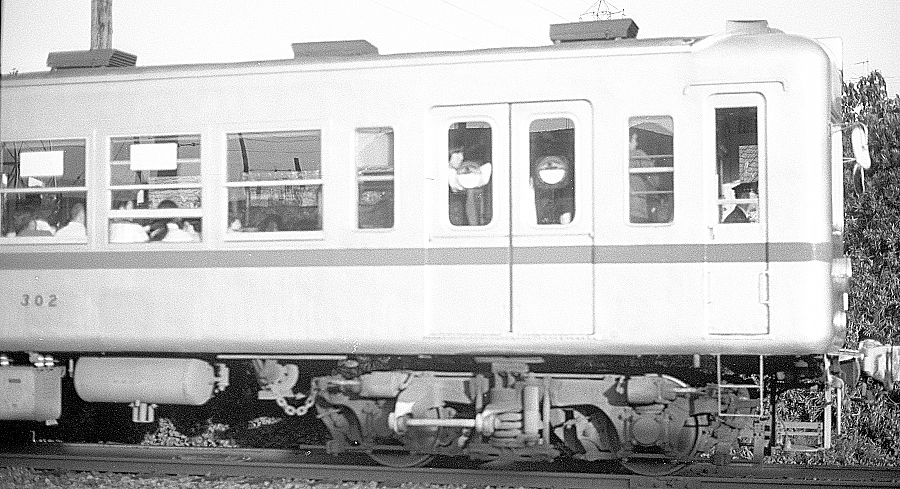| ↑クモハ303号はワイパーの駆動の軸穴を通すため、今までの凹ガラスからの特注費を削減したのか完全小窓化した。 クモハ303とクモハ109前面バックミラーでワンマン対応工事完了か 1977.05撮影 |