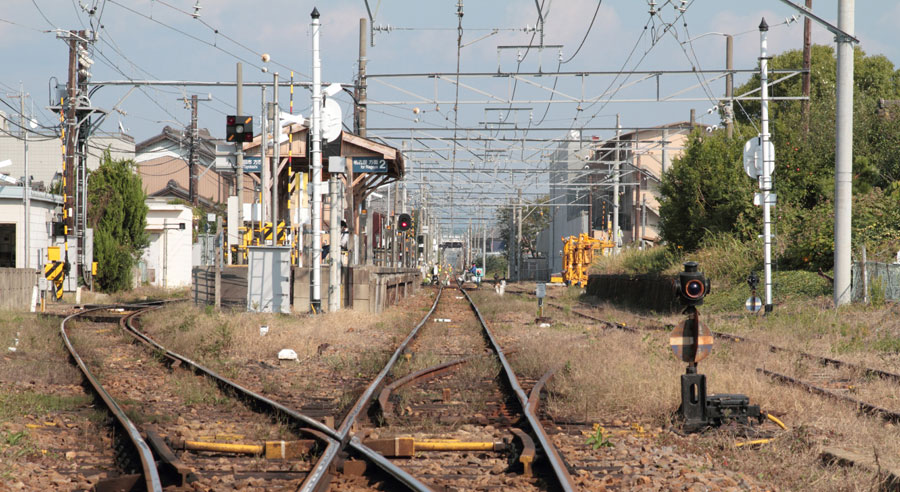 ↑貨車が滞留していたと思われるヤードがある三河知立駅。矢羽根と夜間色灯がひっそりと。