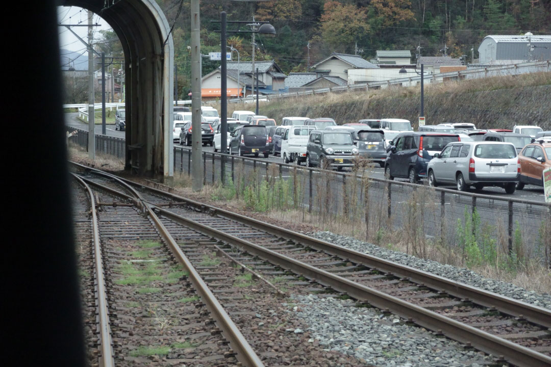 | ↑水落駅2020 ピントが車内に合っている 左側は駐車場 |