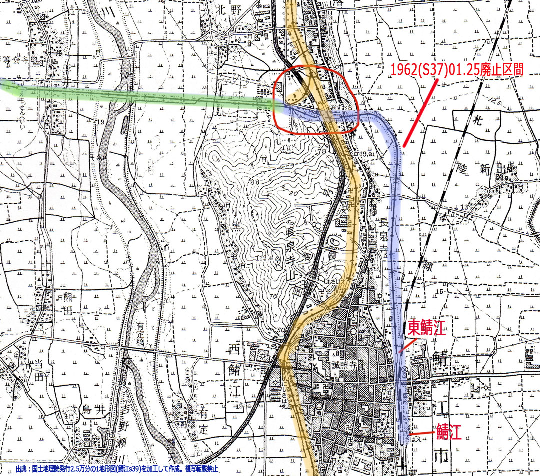 (5)国鉄北陸線の複線電化に伴う用地等の問題から水落(連絡線)~鯖江間は1962(S37)1.25に廃止された。 |