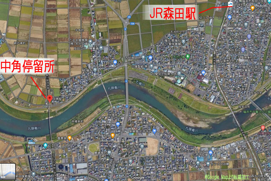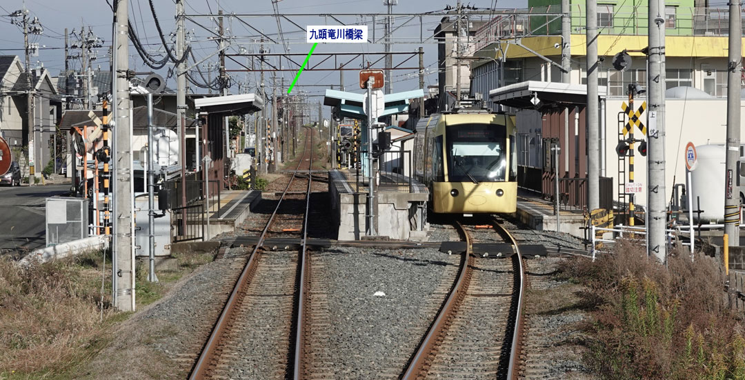 当駅までが福井市街の範囲で、後方は九頭竜川橋梁、川を境に域が異なる