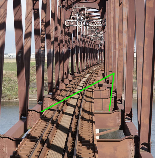 旧橋梁を避けて新設、工事の関係で下流側に橋脚を2基建てたため、3連のトラスを折り曲げて設置、橋梁内を線路がカーブしている、珍しい「く」の字形の架橋構造を持つ。