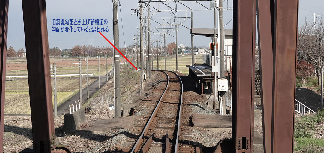 新橋梁の水面上高さも嵩上げされており、画面中央の勾配標が2箇所あるあたりから土盛りされたのか?勾配が急になっている。