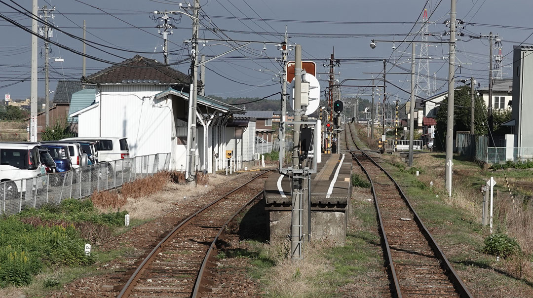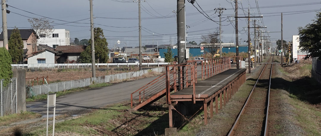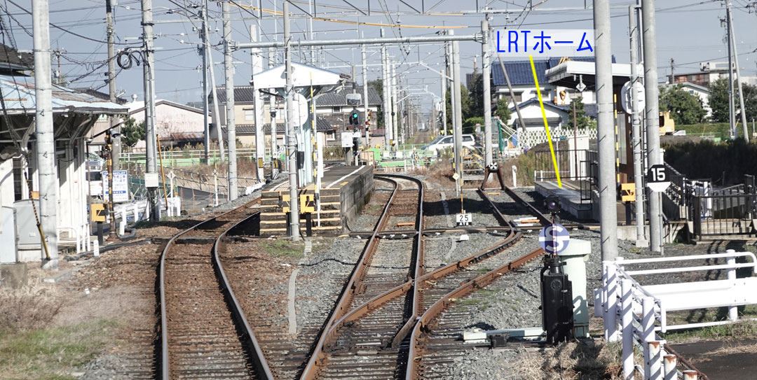 LRTホーム新設は見送られ、LRT列車は通過する。↑築堤上の踏切が廃止されている