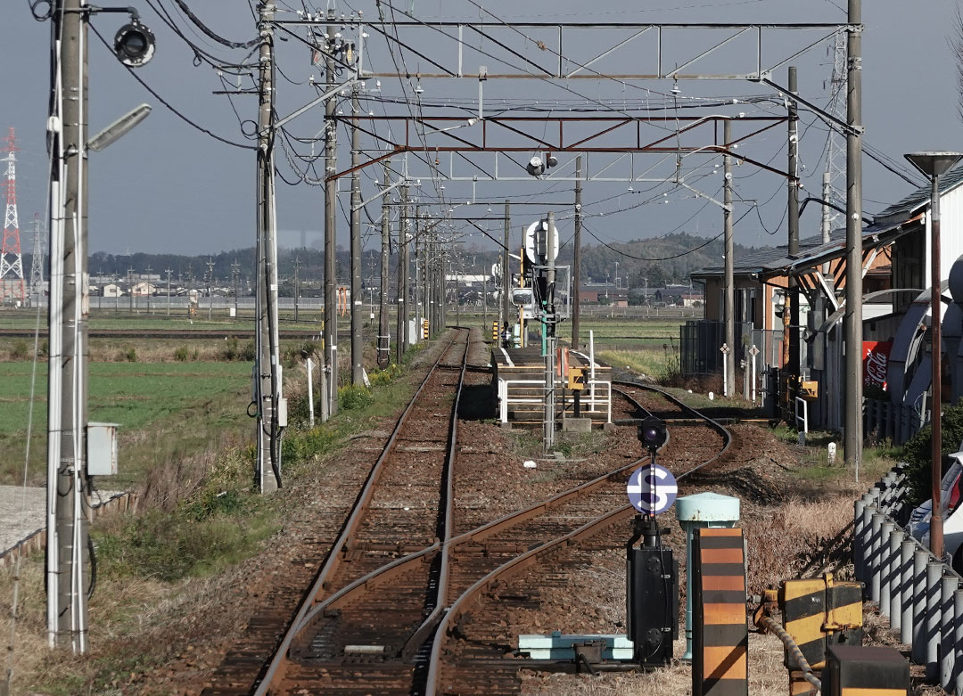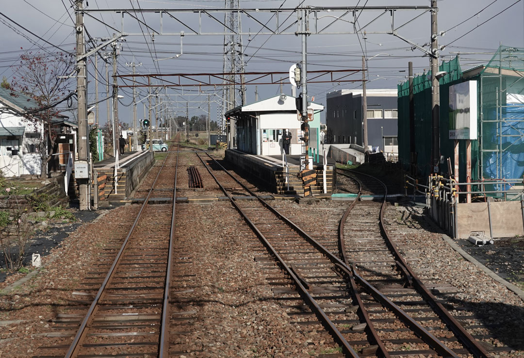 | ↑くさび形に狭くなっている。↓福井口まで単線になって途中、新福井が交換駅に。 |