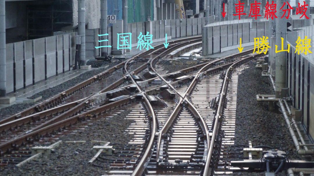 ↓福井口の高架線分岐。車庫線は高架から急勾配で下る。 |