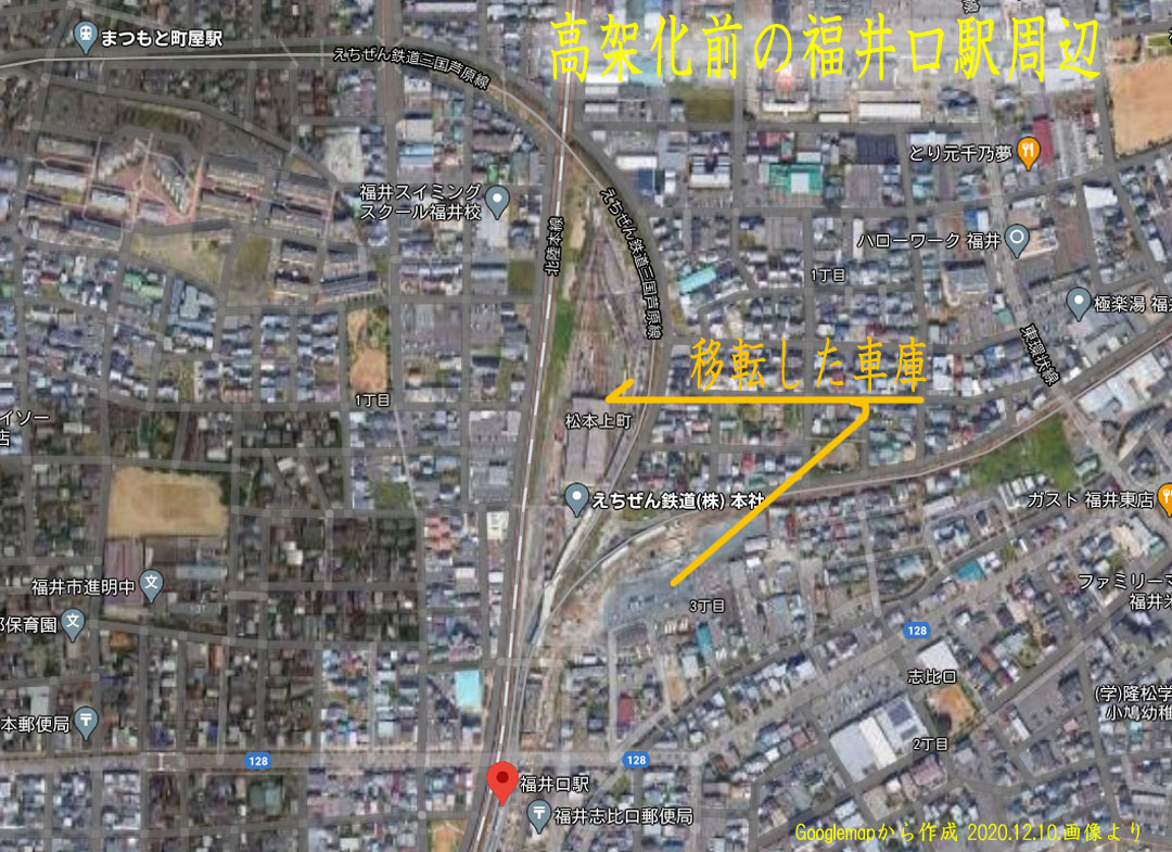 ↑この写真から時代を経て、えちぜん鉄道三国芦原線高架化前のGooglemap画像↓ |