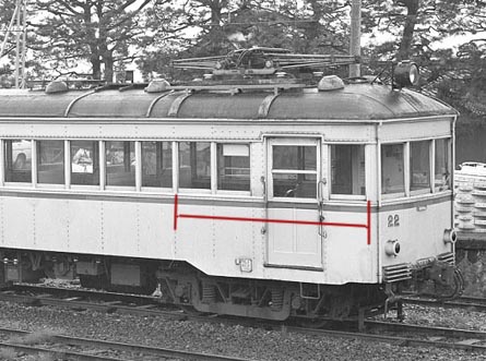 ↑オリジナル車体デハ22の扉位置(当車はデハ2の中央扉を埋めて2扉化) |