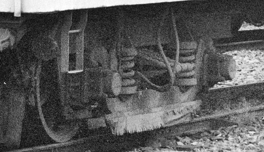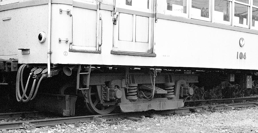 拡大して確認すると各車装着していた。鮮明な104台車では塗油コックやホースが見える
