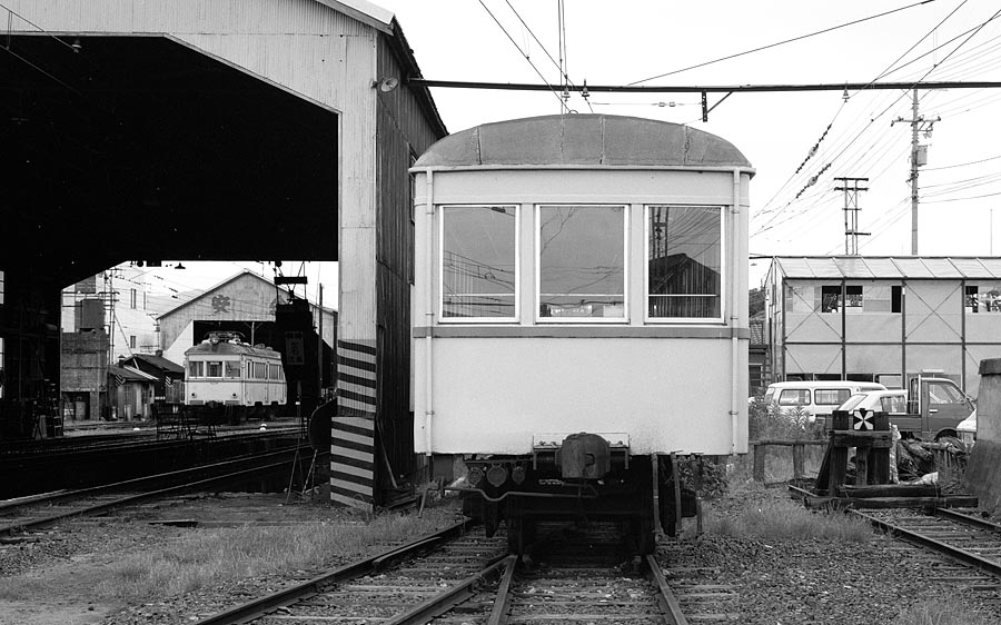 クハ102の台車像がなにかオカシイので拡大。レール塗油器らしいものを装着しているようだ。