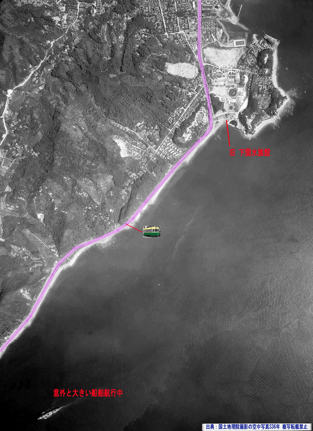 ↑空中写真の楽しみは走行車両がいるかどうか。まさに下関に向けて駅前から国道に進行中