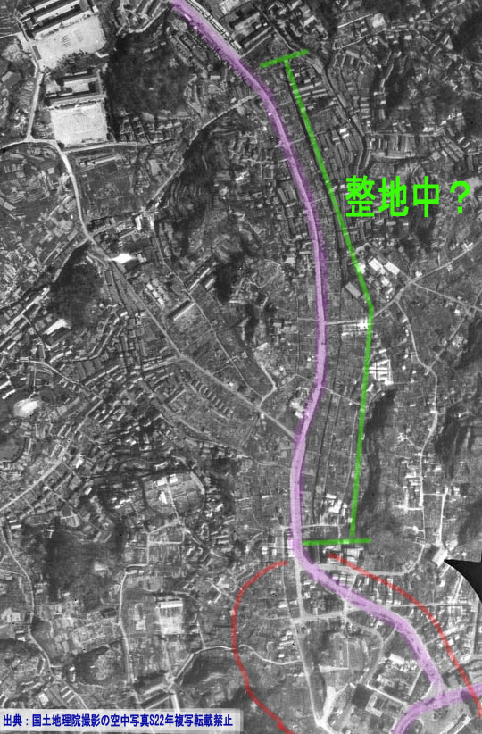 | ↑ S22年撮影 家屋の区画整理と道路赤線囲に注意 |