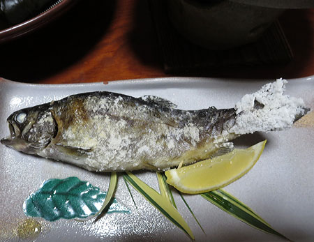 | ↑ニジマスの塩焼き。大振りで食べ応え充分 |