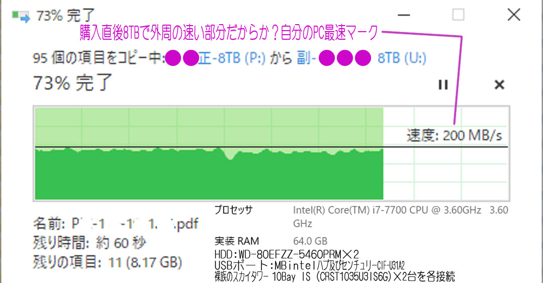 ■異なるケースのHDDから1TB程度の転送を行って順調。 ■転送試験しました HDDの相互の性能もありますので目安です。
