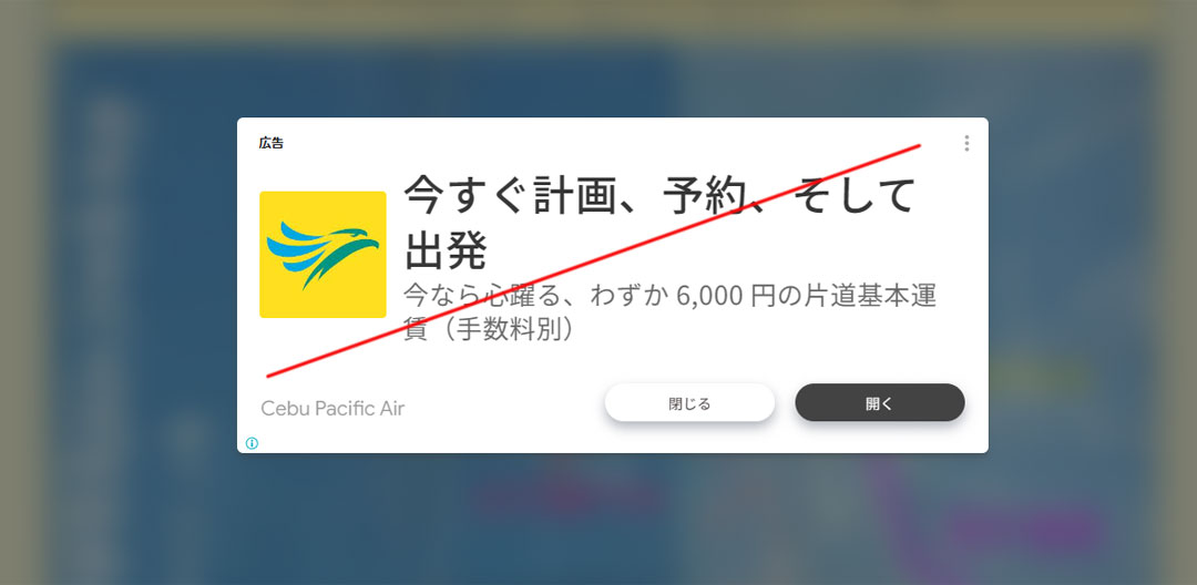 広告は触らず「×」、「閉じる」がおすすめです←これも危ない場合あり |