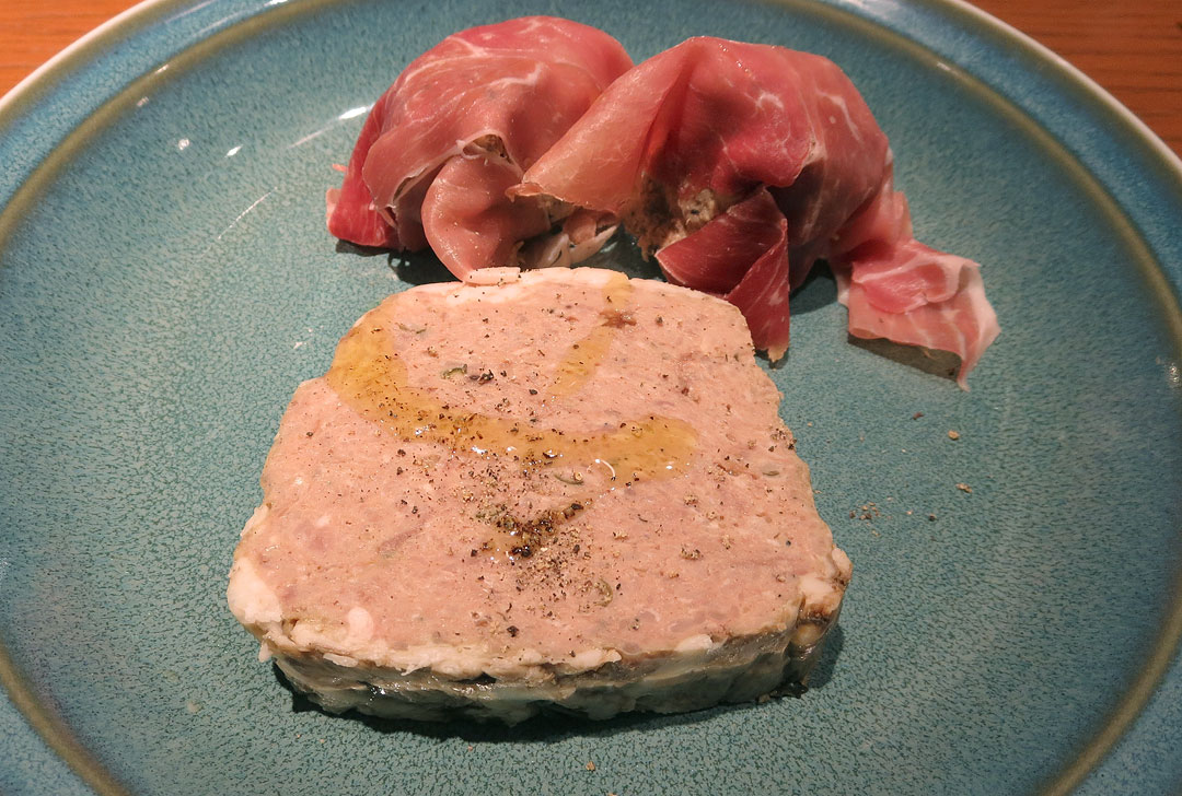 ↑(上) 鶏肉と黒トリュフのテリーヌ生ハム仕立て