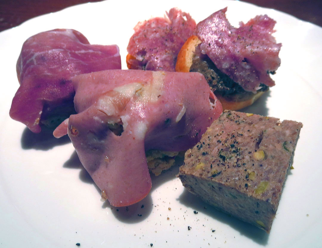 鶏のテリーヌ、ポテサラ、黒豚パテ、パニーニ信玄鳥を