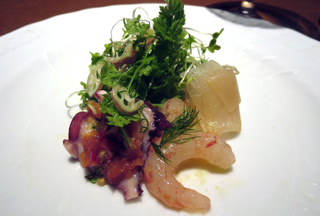 ↑某魚商店のビキビキのタコと縞海老カルパッチョ