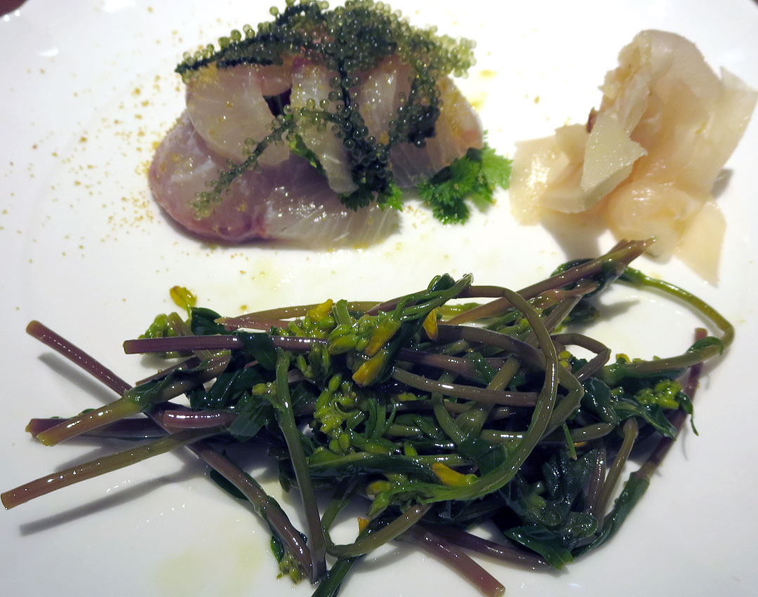 ↑ヒラマサ海ぶどうと手作り洋風ガリ、菜の花とホニャララ(忘れ)草
