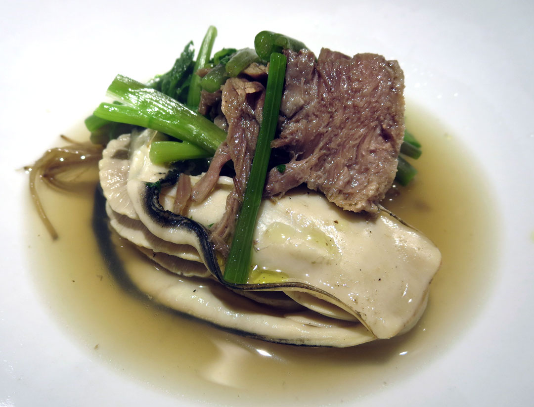↑牛頬リラッサ風セリと煮込み、赤崎産2年物牡蠣スープ