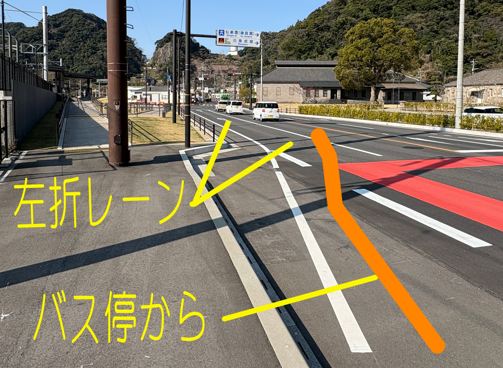 ※行政による左折レーン上に存置されていたバス停強制撤去