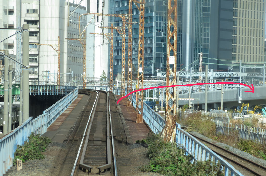 | ↑品川新駅に接近。右側は北行乗越勾配の取付部 |