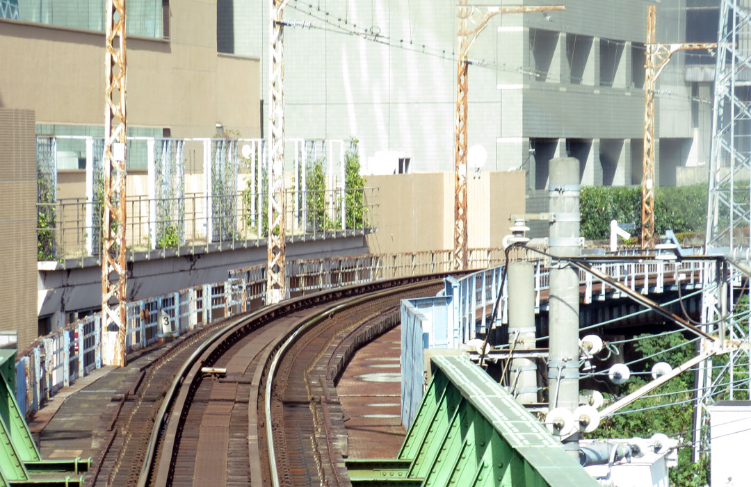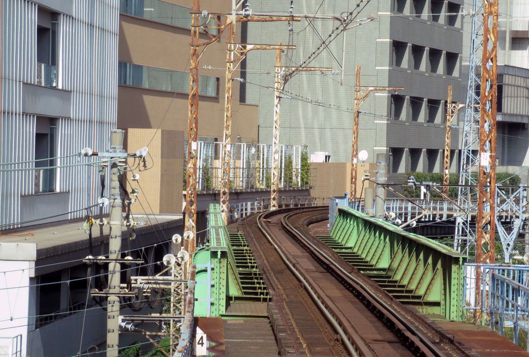 | ↑京浜東北線北行の山手線乗り越し高架の田町側に降りる線路 |