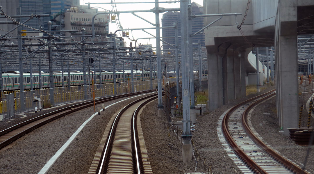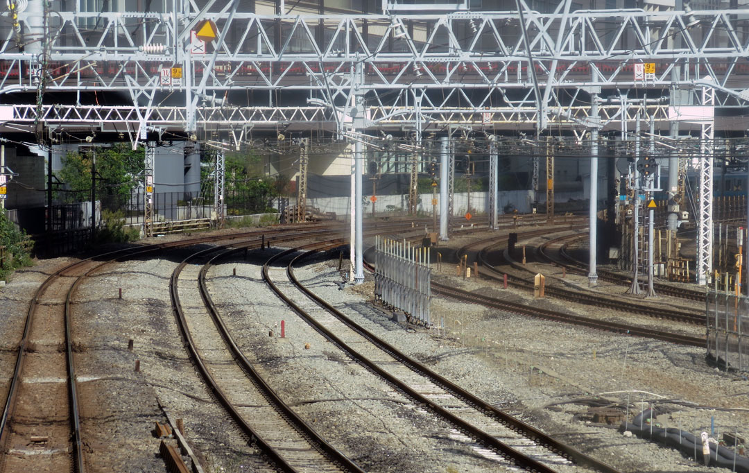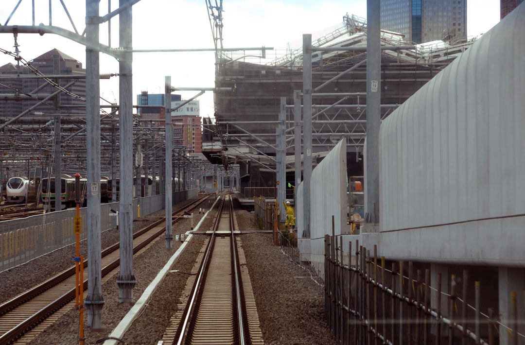 | ↑品川駅に接近。保守用機械、車両の乗越ポイントが山手線内回りから続く。山手外回りの線路敷設中 |
